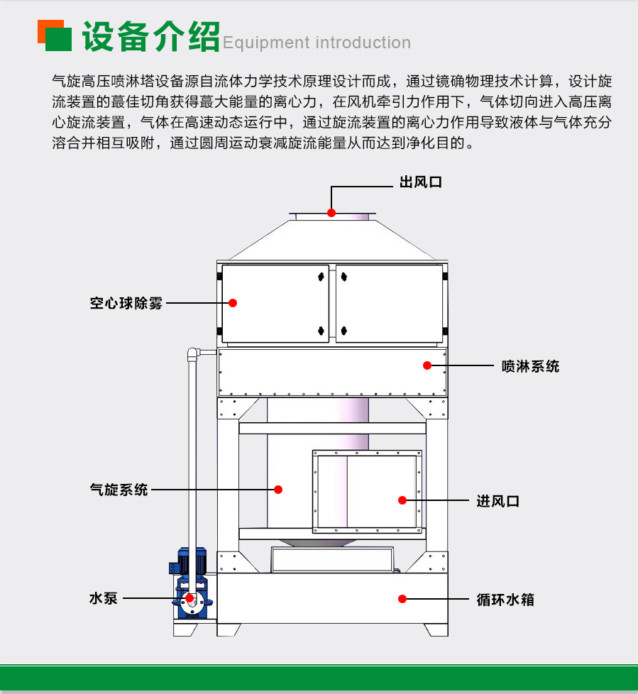 簡介:雙筒氣旋噴淋塔簡介一、 設備凈化技術說明雙級氣旋噴淋塔利用氣體與液體之間的接觸進行氣液分離。氣體中的污染物傳送到液體中,與液體充分接觸洗滌,它能有效分離氣體中含塵含味物質,降低氣體溫度,凈化污染氣體,達到清凈空氣的目的。二、設備凈化過程含塵含味氣體通過吸氣罩收集,在風機的作用下,經過管道輸送負壓進入雙級氣旋噴淋塔。氣旋混流裝置快速運轉,多級連續的凈化使得含塵含味氣體與水霧充份混合,在離心的作用下達到...