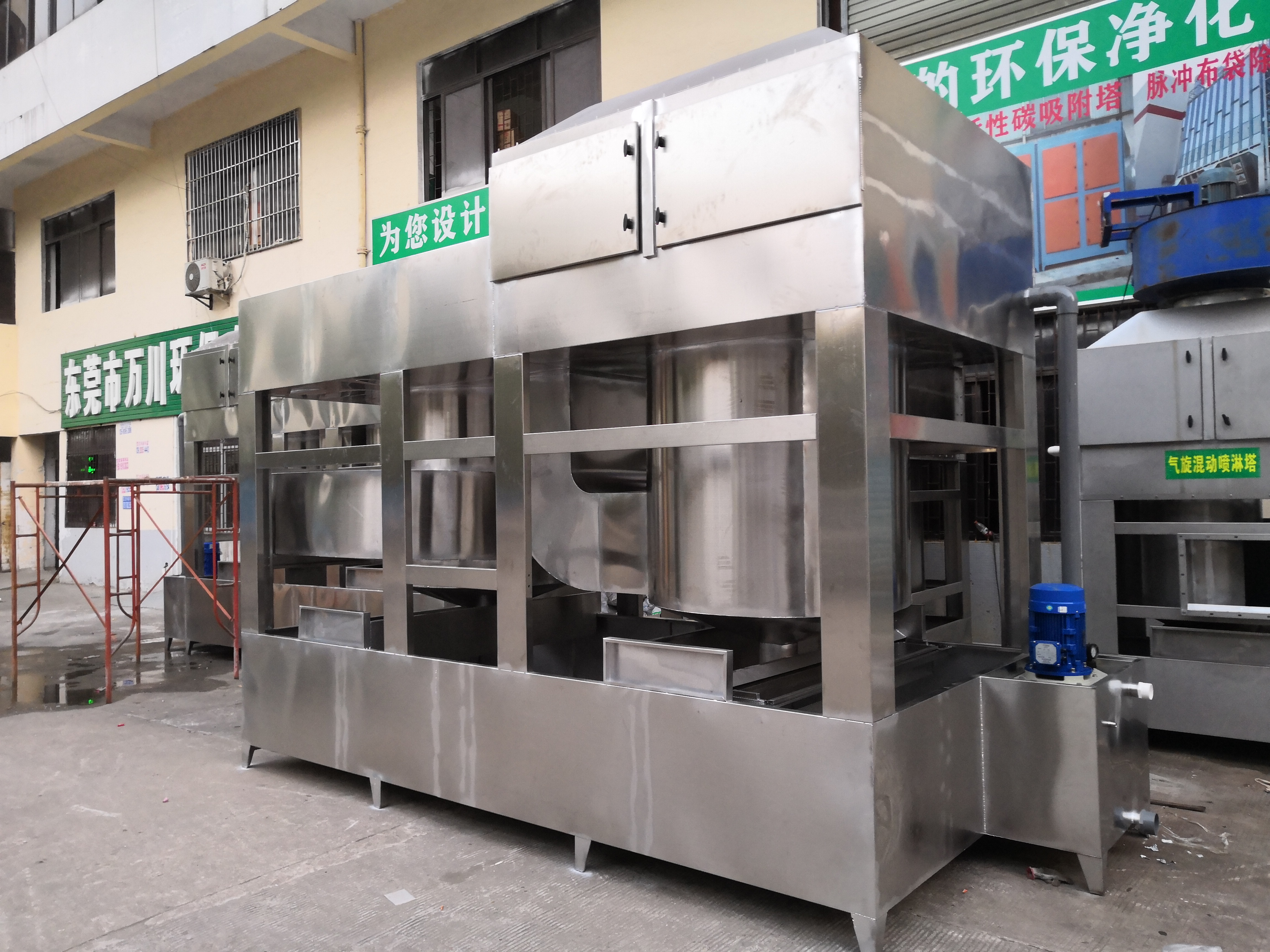 含塵含味氣體通過吸氣罩收集,在風機的作用下,經過管道輸送負壓進入雙級氣旋噴淋塔。氣旋混流裝置快速運轉,多級連續的凈化使得含塵含味氣體與水霧充份混合,在離心的作用下達到氣液分離。氣旋桶內部采用水泵循環給水,水在水箱經水泵增壓后自螺旋噴嘴霧化而出,最后回流至水箱循環使用。分離出來的雜物下沉到水箱底部,經凈化后的氣體進入填料隔水層,然后由風機排出。