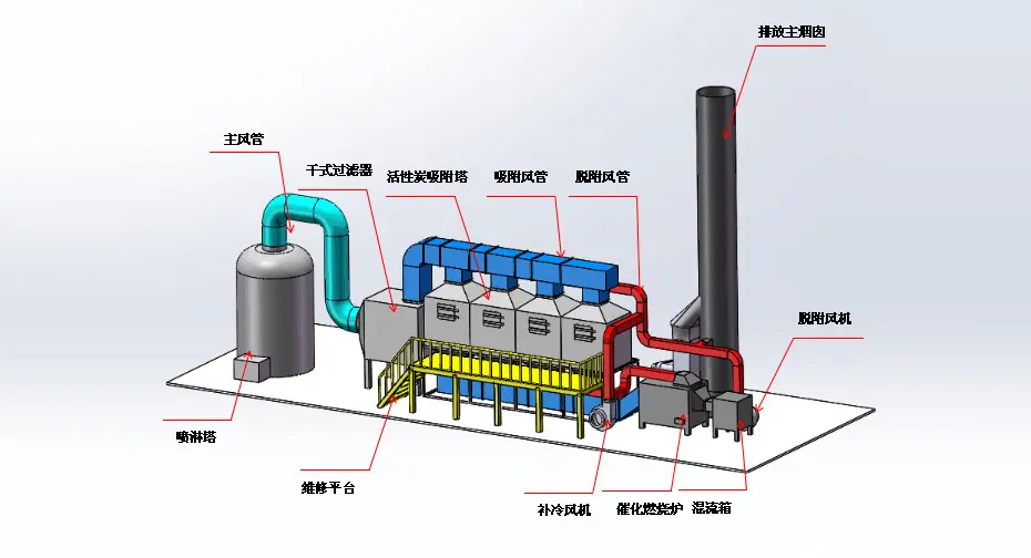 催化凈化是典型的氣固催化反應,其實質是活性氧的氧化。在催化凈化過程中,催化劑的作用是降低活化能。同時,催化劑表面具有吸附作用,使反應物分子在催化劑表面富集,提高了反應速率,加快了反應速度。在催化劑的作用下,廢氣可以在較低的著火溫度下進行無焰燃燒,并被氧化成CO2和H2O。同時,大量的熱能被釋放出來,從而達到去除廢氣中污染物的方法。通過活性炭吸附,將風量大、濃度低的廢氣濃縮成風量小、濃度高的廢氣,在進入RCO裝置進行處理,可節約運行成本。
