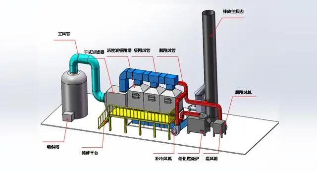 系統由5個活性炭吸附箱(4用1備),1個催化燃燒床構成,將各條生產線中的所有排氣管合并連接引入凈化設備,各個支管上安裝一只手動調節閥,配比調節風量;在吸附凈化裝置與廢氣進口之間安裝一套預處理干式過濾器,過濾少量的粉塵,從而避免活性炭微孔被堵塞,然后送入活性炭吸附箱進行吸附凈化,當其中一活性炭吸附器接近飽和時,系統將自動切換到備用活性炭吸附箱(此時飽和活性炭吸附箱停止吸附操作),然后用熱氣流對飽和活性炭吸附箱進行解吸脫附,將有機物從活性炭上脫附下來。在脫附過程中,有機廢氣已被濃縮,濃度后的濃度較原濃度提高幾十倍,達2000ppm以上,濃縮廢氣送到催化燃燒裝置,之后被分解成CO2與H2O排出。完成解吸脫附后,活性炭吸附器進入待用狀態,待其他活性炭吸附箱接近飽和時,系統再自動切換回來,同時對飽和活性炭吸附器進行解吸脫附,如此循環工作。之后凈化后的潔凈氣體由主排風機排入大氣中。