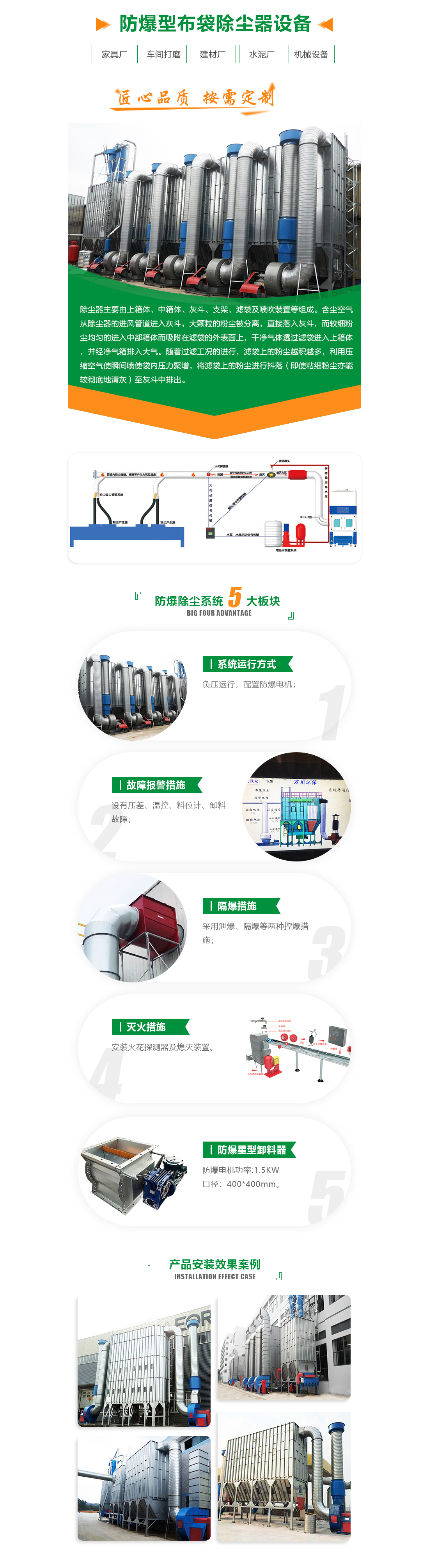簡介:防爆布袋除塵器采用全新防燃、防爆結(jié)構(gòu)設(shè)計,外加齊全的安全監(jiān)測與消防措施,如除塵器箱體增加了泄爆片、除塵器頂部安裝消費噴淋管、溫控模塊、壓差模塊等.。消除了收塵器內(nèi)部燃燒、爆炸的隱患,確保了除塵器長期穩(wěn)定、高效地運行。